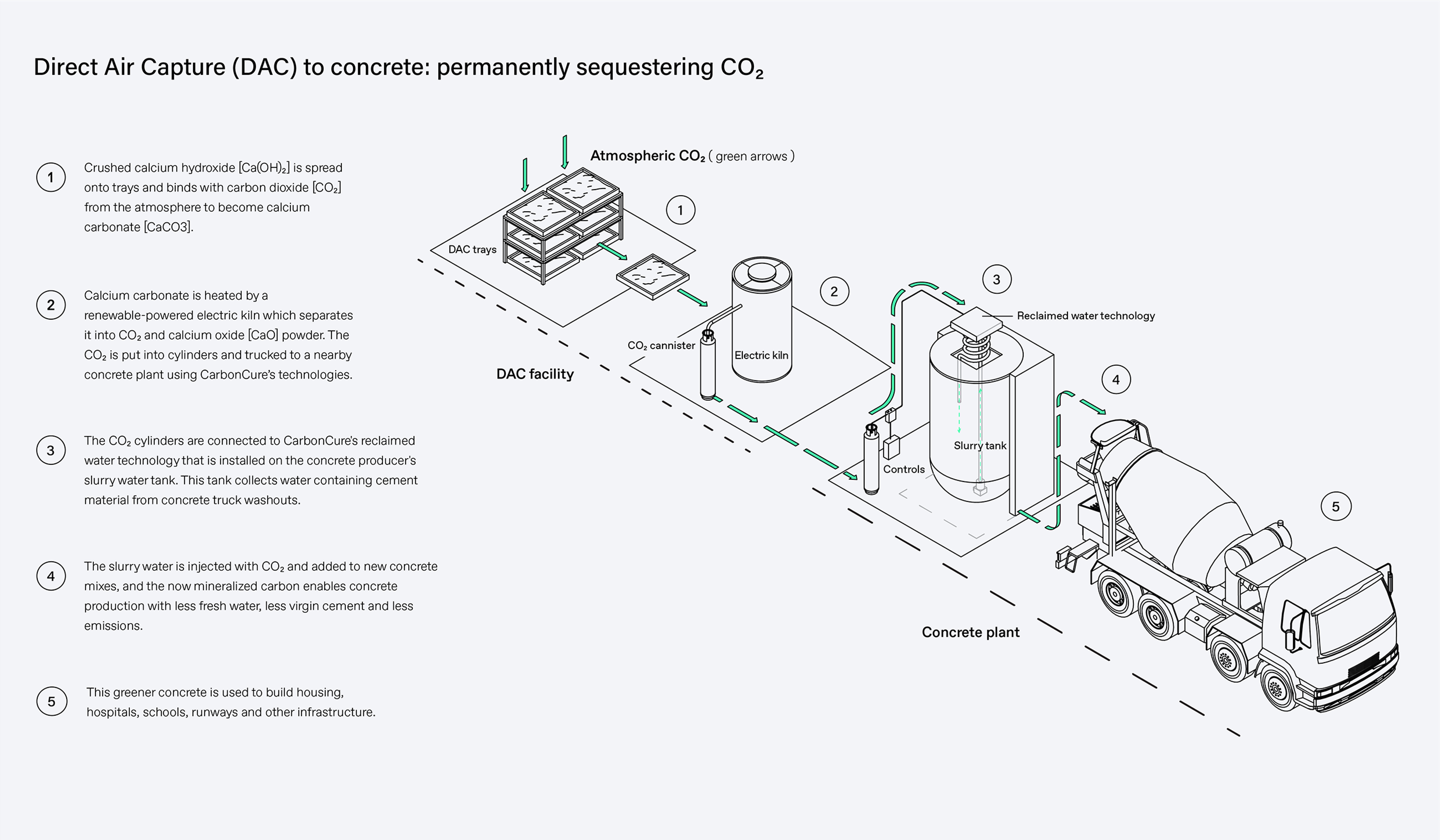 Heirloom captured CO2 from the atmosphere using their DAC technology at their headquarters in Brisbane, California. CarbonCure's Reclaimed Water Technology injected the captured CO2 into recycled water at a Central Concrete batch plant in San Jose, California. Central Concrete used the CO2-treated water to make fresh concrete, which was used across projects in the Bay Area. The CO2 is permanently sequestered in the concrete as calcium carbonate, and will not be returned to the atmosphere for centuries, even if the concrete is demolished.